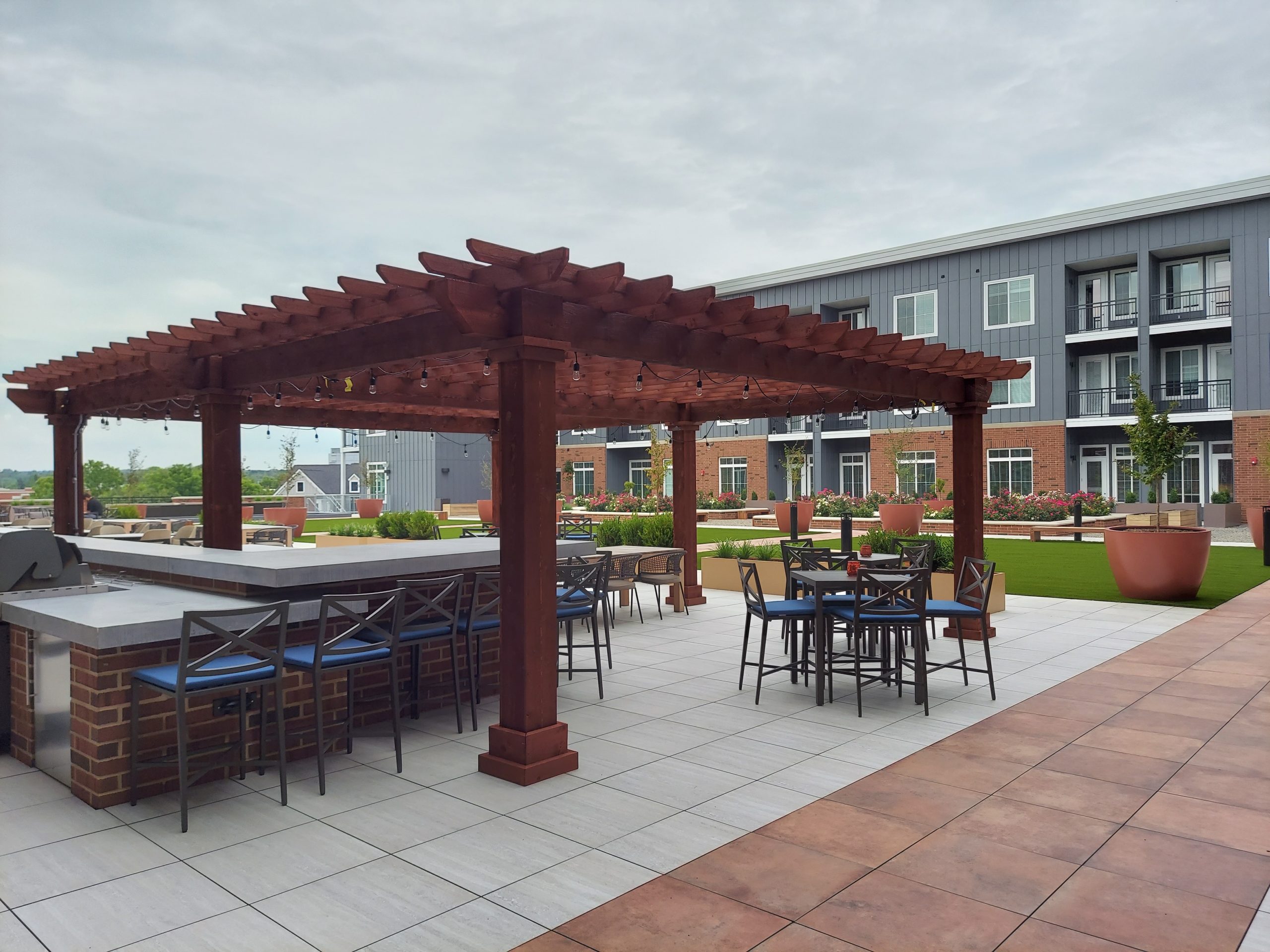 The future of senior living is right now. This luxury resort style 55+ community boost over 9,000 SF+/- artificial turf on structure, 31,000 SF+/- porcelain tile on structure, 7000 SF on grade, 6 pergola structures, two segmental retaining walls & other amenities. These podium level terraces bring this community together through dining, pickle ball, bocce ball, grilling stations or a simple walk in the park.