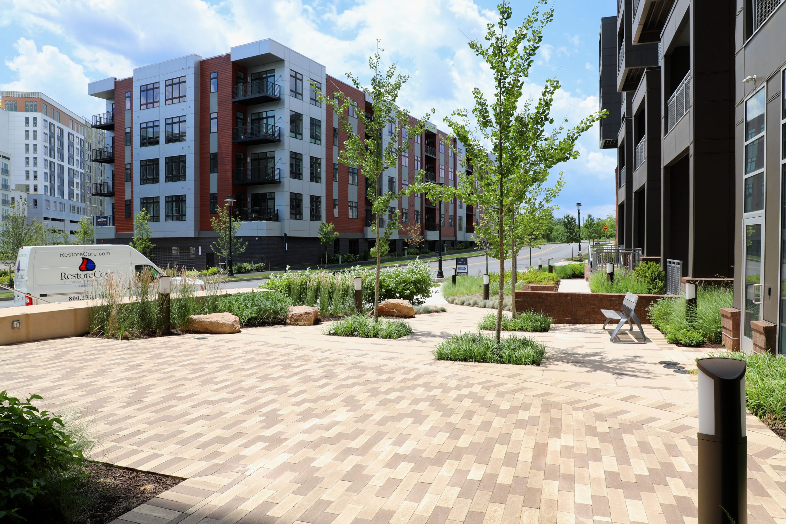 Offering endless amenities that create opportunities for fun and social engagement including a resort-style swimming pool, fitness center, outdoor kitchen, and fire place, The Residences at Midtown Park is not simply a community, it is an Urban Oasis. This project includes a porcelain courtyard, brick streetscapes, concrete paver roadways, and dining plaza.